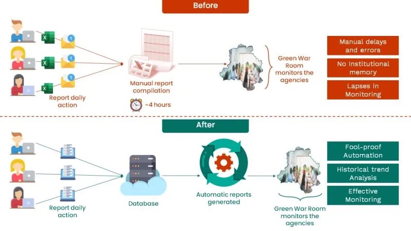 A “Green War Room” in the Environment Department of the Delhi Government monitors the performance of each of these agencies against set targets on a daily basis. Set-up in 2020, the Green War Room throughout its first year depended heavily on monitoring through email communication. 65 emails from these 21 agencies reporting their respective action taken on 13 areas of pollution reduction were received every evening. Given that agencies were free to report their action taken in any format, they would at times provide data along with narrative reports, analyzing which would be a big challenge. This data collection was then followed by a multi-hour effort everyday in compiling these emails into reports that the political and bureaucratic leadership could analyze to monitor actions by agencies and then enforce compliance to improve air quality.